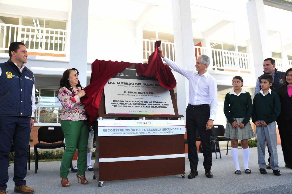 Villa Guerrero, Estado de México, 25 de marzo de 2019. El compromiso del Gobierno estatal es asegurar que los alumnos cuenten con instalaciones educativas seguras mientras se preparan académicamente, afirmó el Gobernador Alfredo Del Mazo Maza, al entregar la Escuela Secundaria General Federalizada ’Guillermo González Camarena’, reconstruida después de que su infraestructura sufrió el 80 por ciento de daño como consecuencia del sismo del 19 septiembre de 2017.