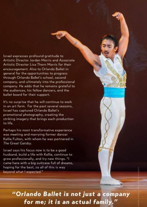 No es sorpresa que continúe trabajando en una forma de arte. Durante varias temporadas, Israel ha capturado la fotografía promocional del Orlando Ballet, creando imágenes impactantes que dan vida a cada producción.