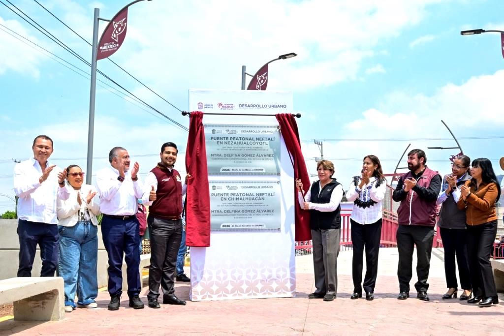 NEZAHUALCÓYOTL, Estado de México.- En este "2026, Año de las Obras en EdoMéx", la Gobernadora Delfina Gómez Álvarez inauguró el Puente Peatonal "Neftalí", que une Nezahualcóyotl y Chimalhuacán, un paso seguro para más de 25 mil habitantes de diversas colonias de ambos municipios.