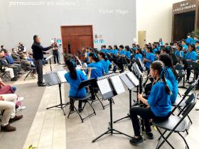 Interpretan Mosaico para ensamble de metales, del compositor Dmitri Dudin, escrita especialmente para la OSEM con motivo del 50 aniversario de la agrupación.