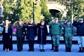Acompañan a la Maestra Delfina Gómez integrantes del Gabinete estatal, de la Mesa de Coordinación para la Construcción de la Paz, alumnas y alumnos de nivel secundaria, elementos de corporaciones de seguridad, para rendir honores al lábaro patrio.